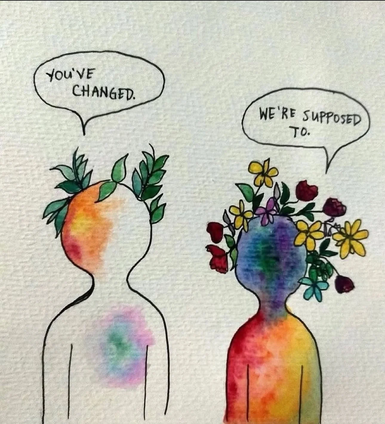 A colorful drawing of two human figures with flowers growing from their heads. The figure on the left has a speech bubble that says 'YOU'VE CHANGED.' and the figure on the right has a speech bubble that says 'WE'RE SUPPOSED TO.'.